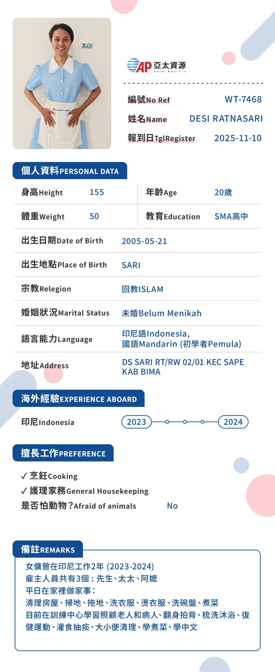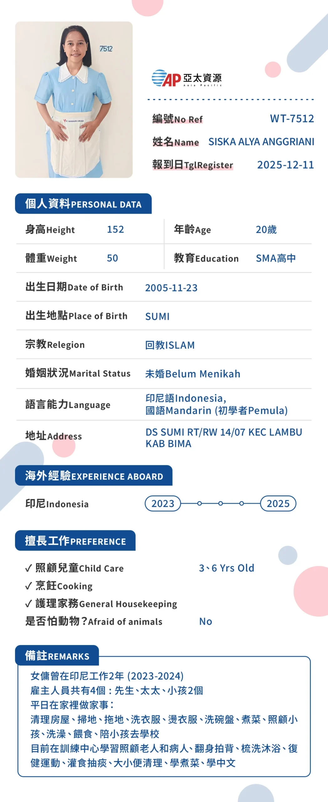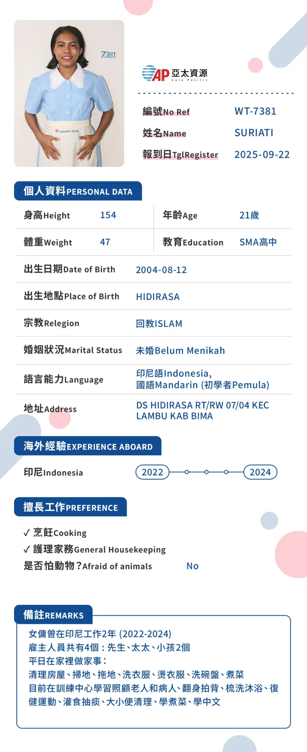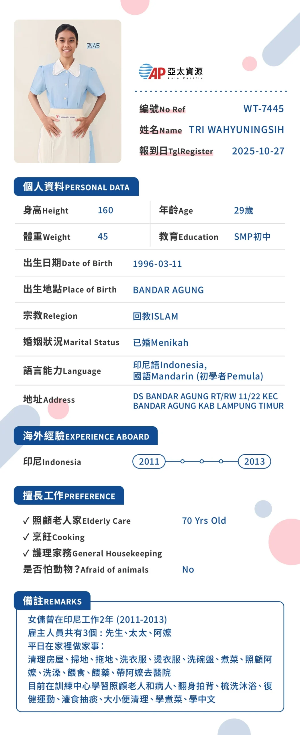 我們相信,給家人最好的照顧,源自於事前的充分準備。透過在印尼當地的嚴格篩選與訓練,亞太不僅為您提供人力,更為您引進一位懂得長輩心聲的專業照護隊友。