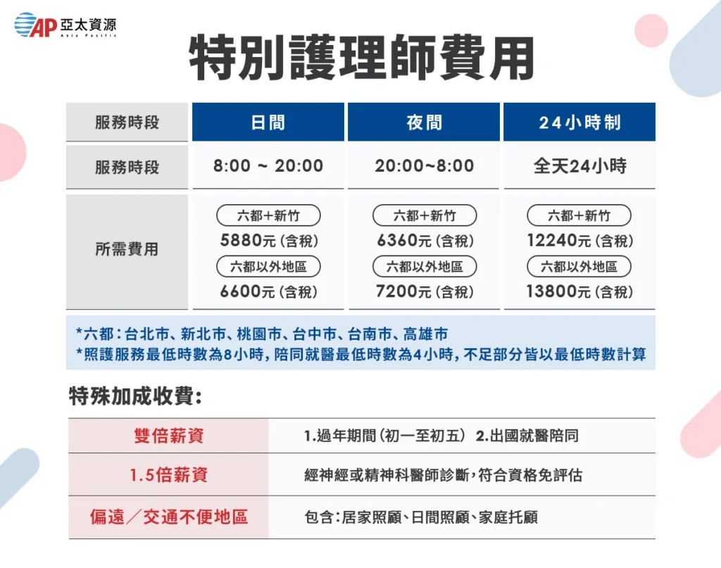 特別護理師的費用依服務時段與地區而定,六都地區日間 12 小時約 5,880 元、夜間約 6,360 元、全天約 12,240 元;六都以外地區則為 6,600 元、7,200 元與 13,800 元,特殊時段或高風險照護將加收 1.5 至 2 倍費用。